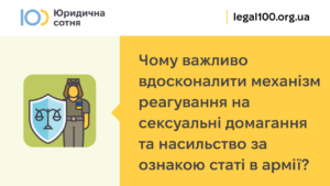 - Наразі немає спеціальних нормативно-правових актів, які б регламентували процедури, спрямовані на запобігання та протидію насильству за ознакою статі чи сексуальним домаганням в армії.